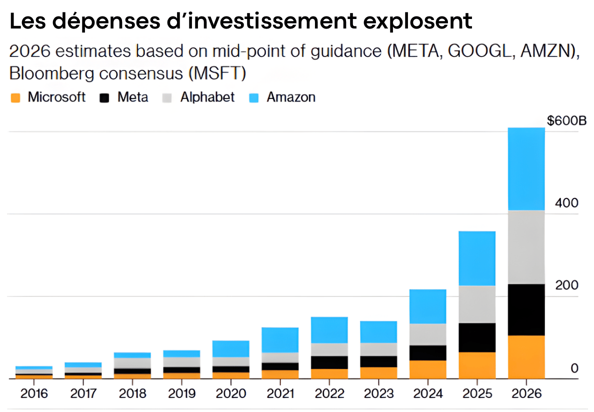 D'ici fin 2026, les quatre géants du secteur (Meta, Amazon, Google, Microsoft) comptent dépenser 602 milliards de dollars dans ces infrastructures. C'est une hausse de 160 % en deux ans, un montant qui dépasse largement les prévisions des analystes. La Silicon Valley a maintenant besoin de béton et d’acier.