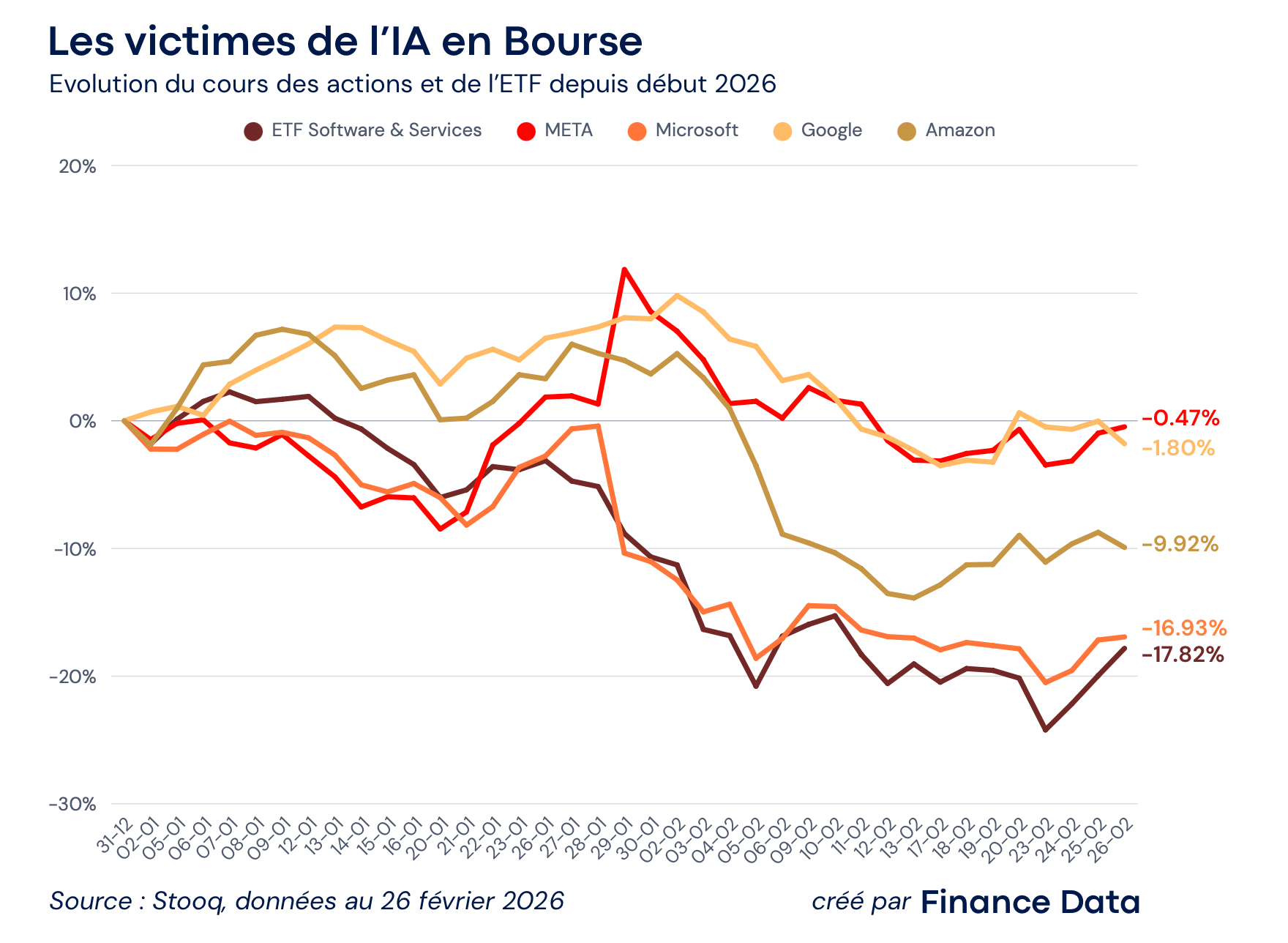 -17% pour Microsoft, -10% pour Amazon⊠Depuis dĂ©but 2026, le vent tourne sur les marchĂ©s : les investisseurs dĂ©laissent les actions tech pour se tourner vers des entreprises de secteurs plus dĂ©fensifs comme lâĂ©nergie, la santĂ© ou lâindustrie.