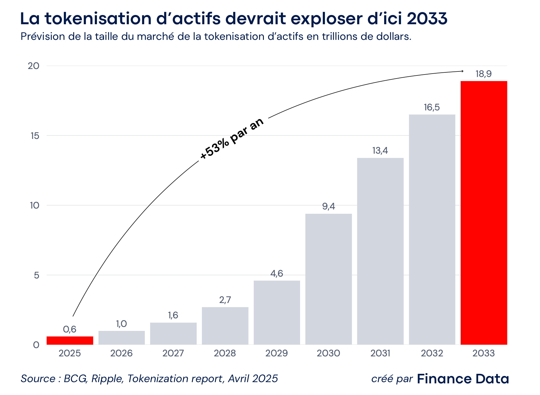 C'est le but de la tokenisation : transformer un actif réel (immobilier, tableau, obligation) en "version numérique" sur la blockchain. Un marché dont la taille devrait passer de 0.6 trillion aujourd'hui à 18.9 trillions de dollars d'ici 2033.